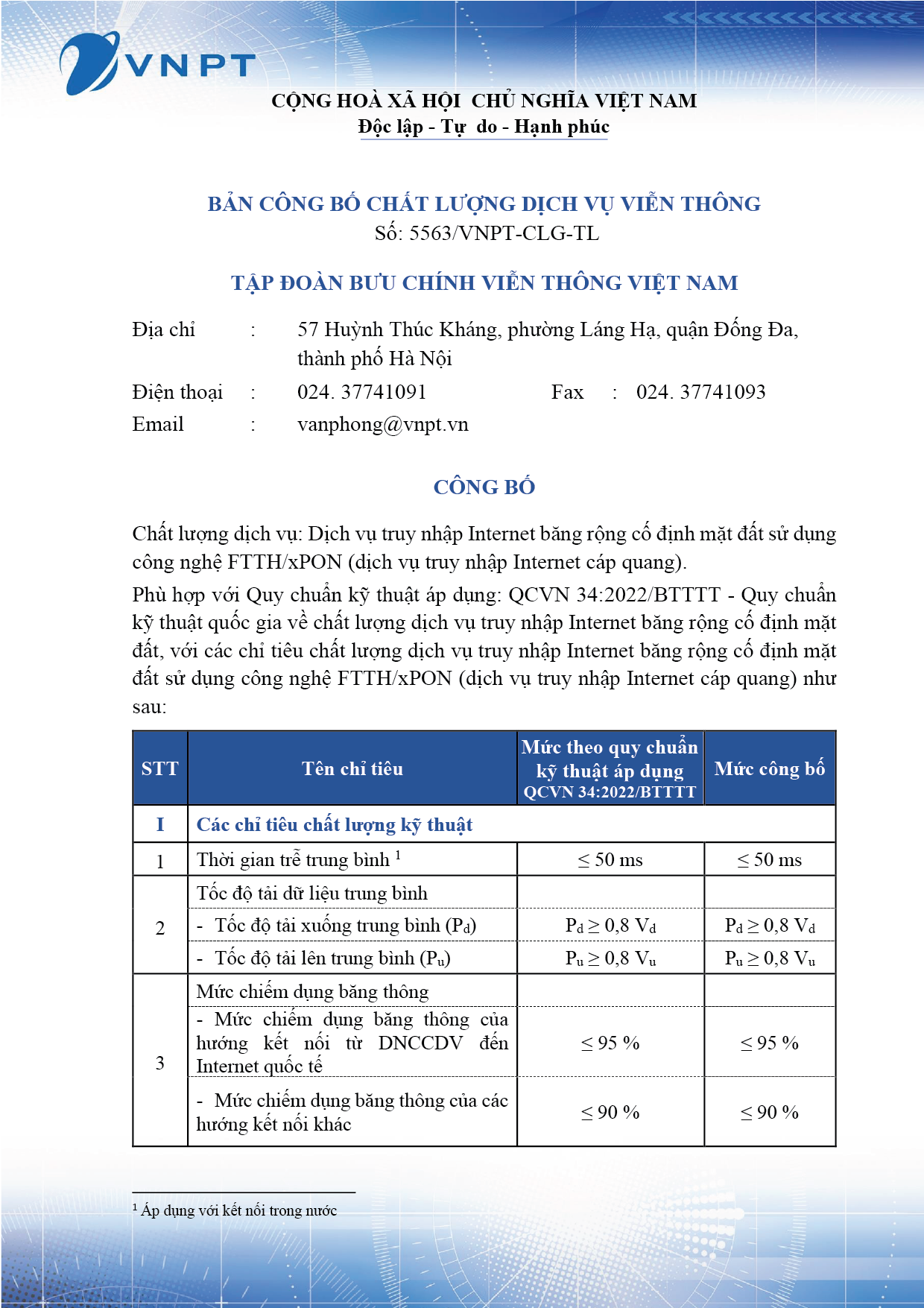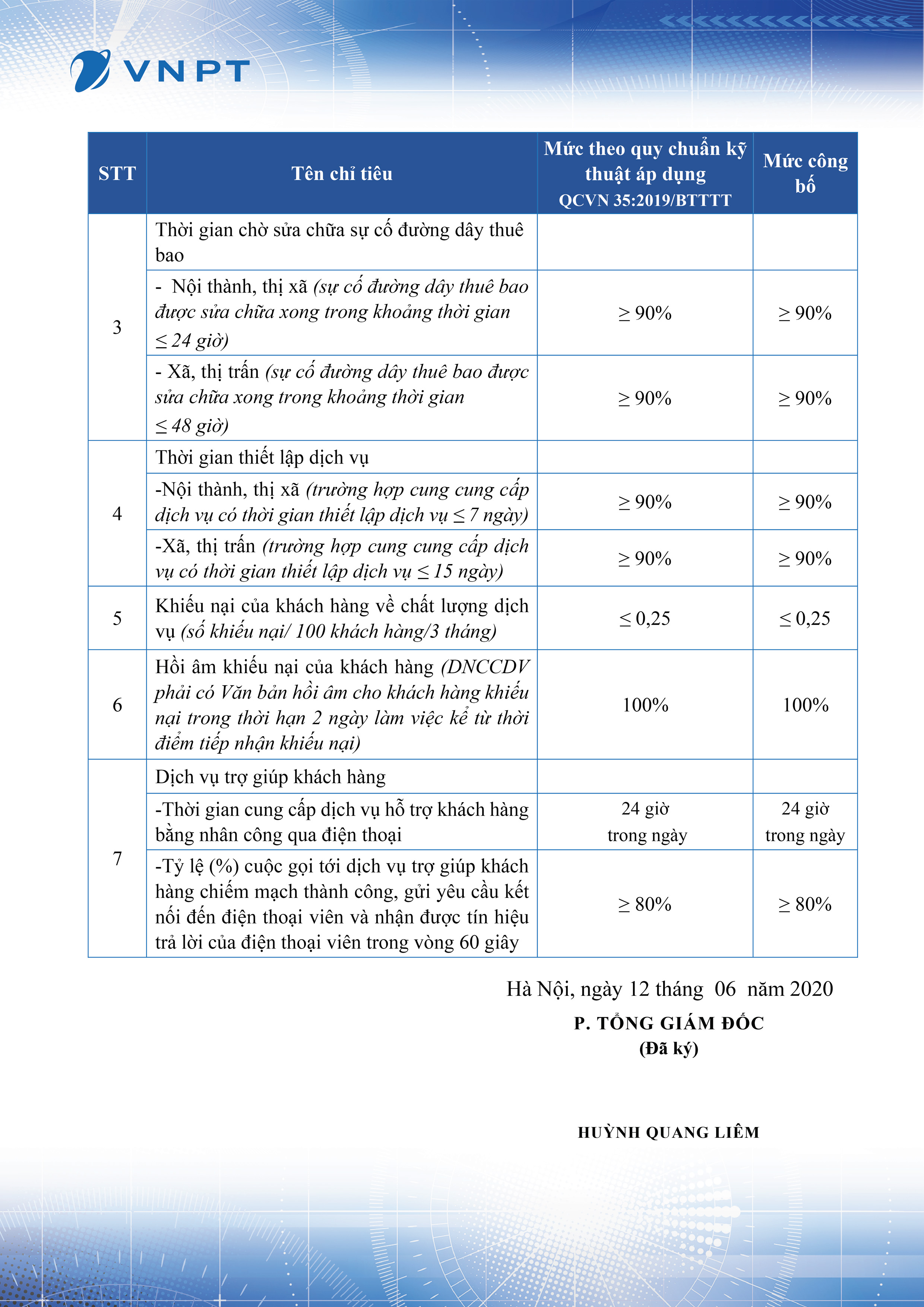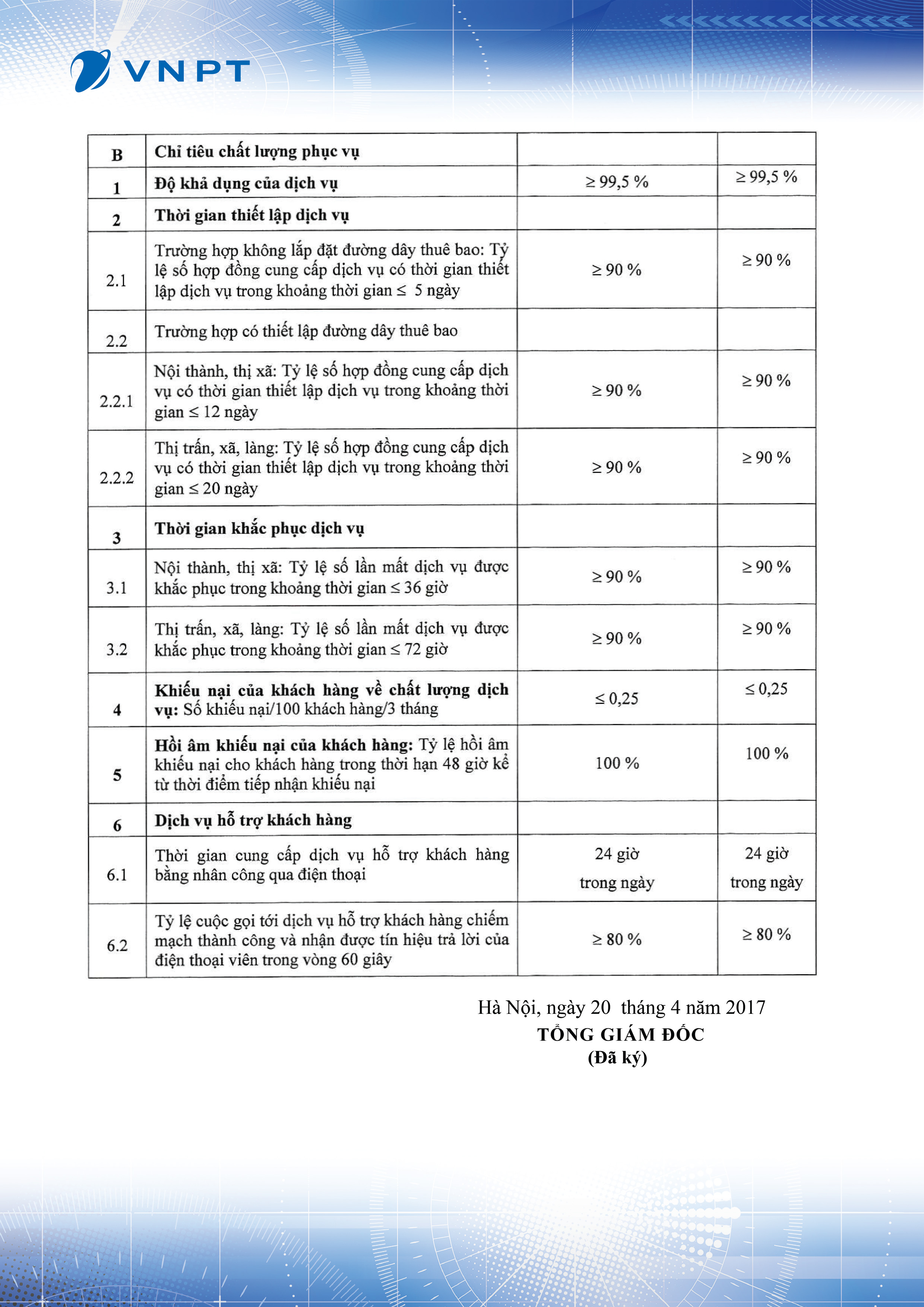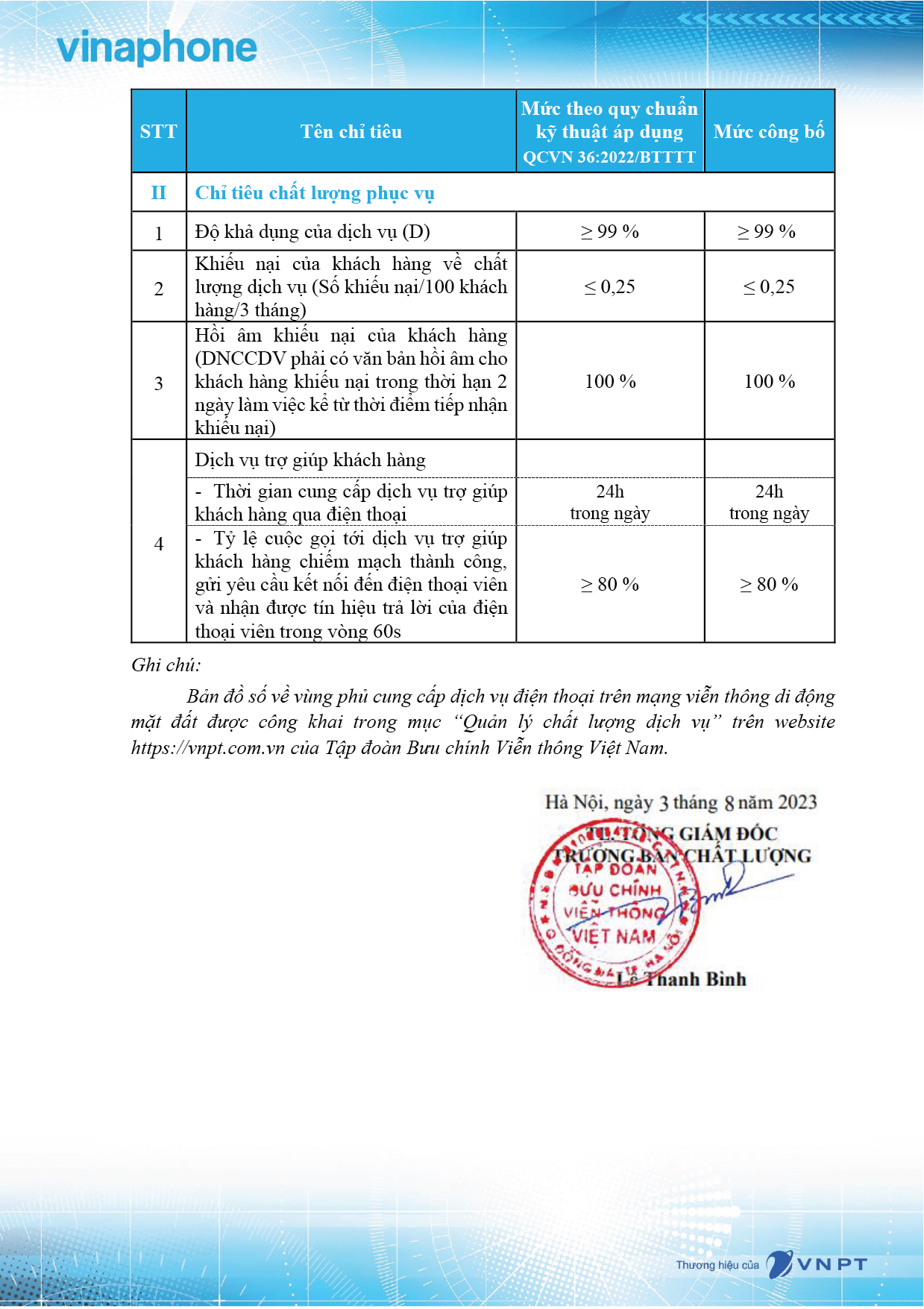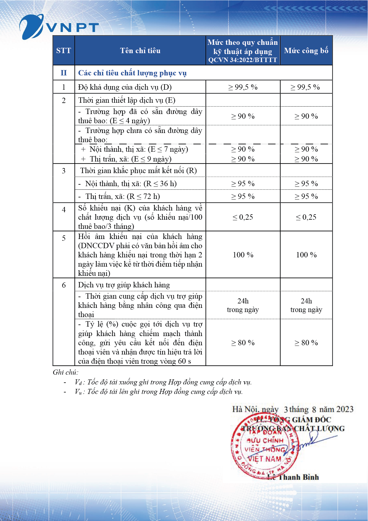 BẢNG CÔNG BỐ CHẤT LƯỢNG DỊCH VỤ VIỄN THÔNG