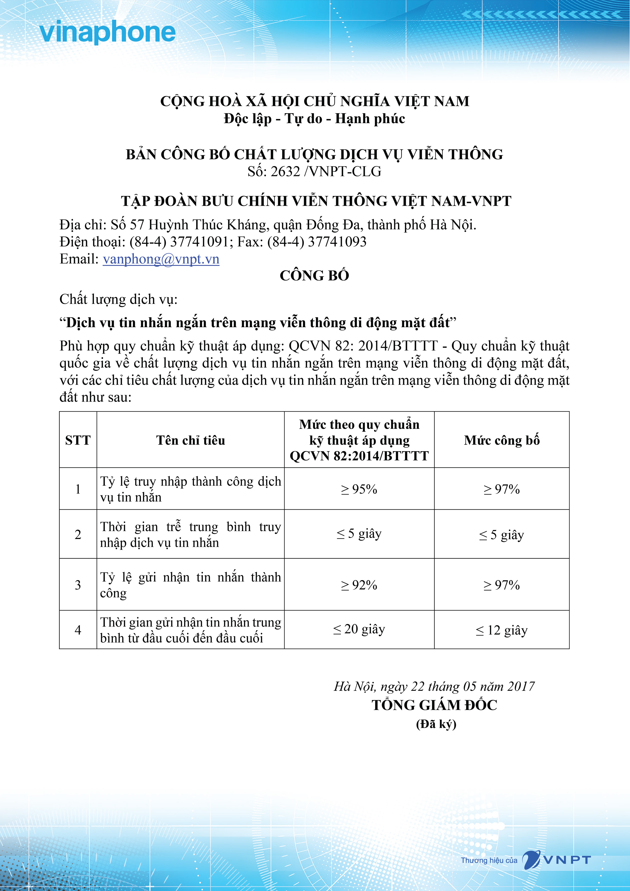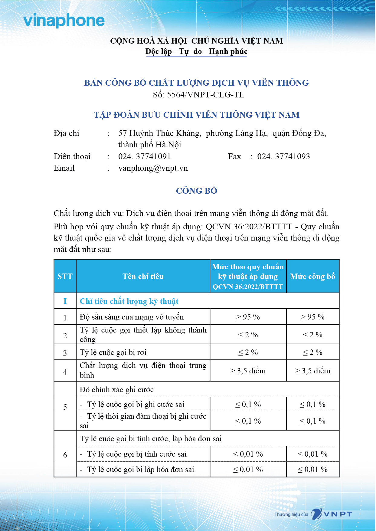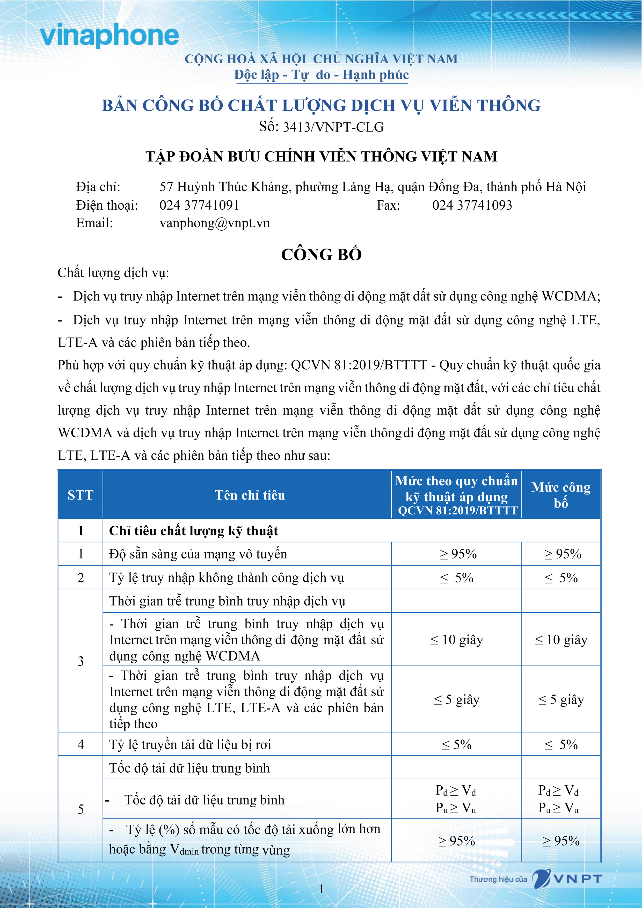 1. Công bố chất lượng Dịch vụ điện thoại trên mạng viễn thông di động mặt đất