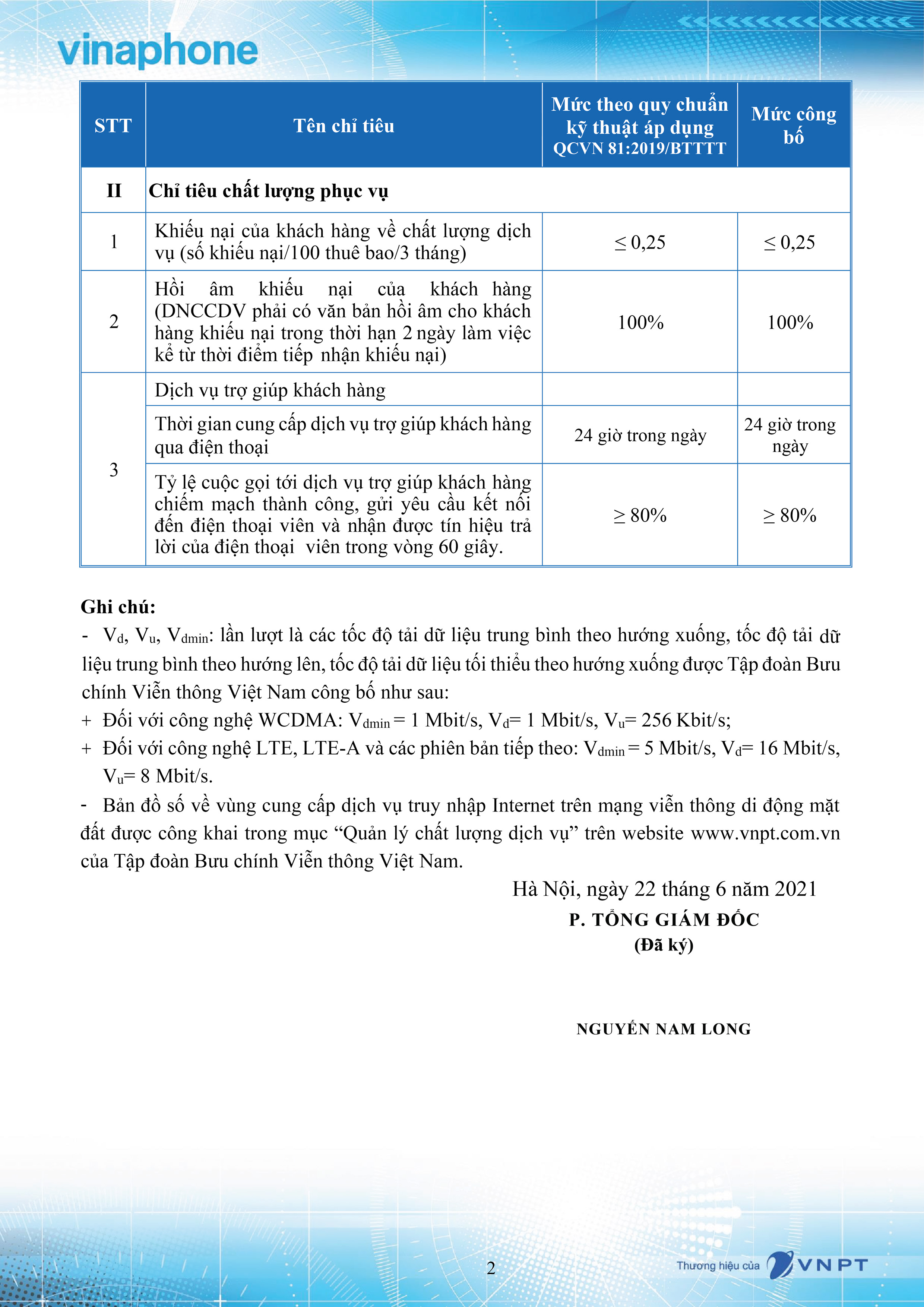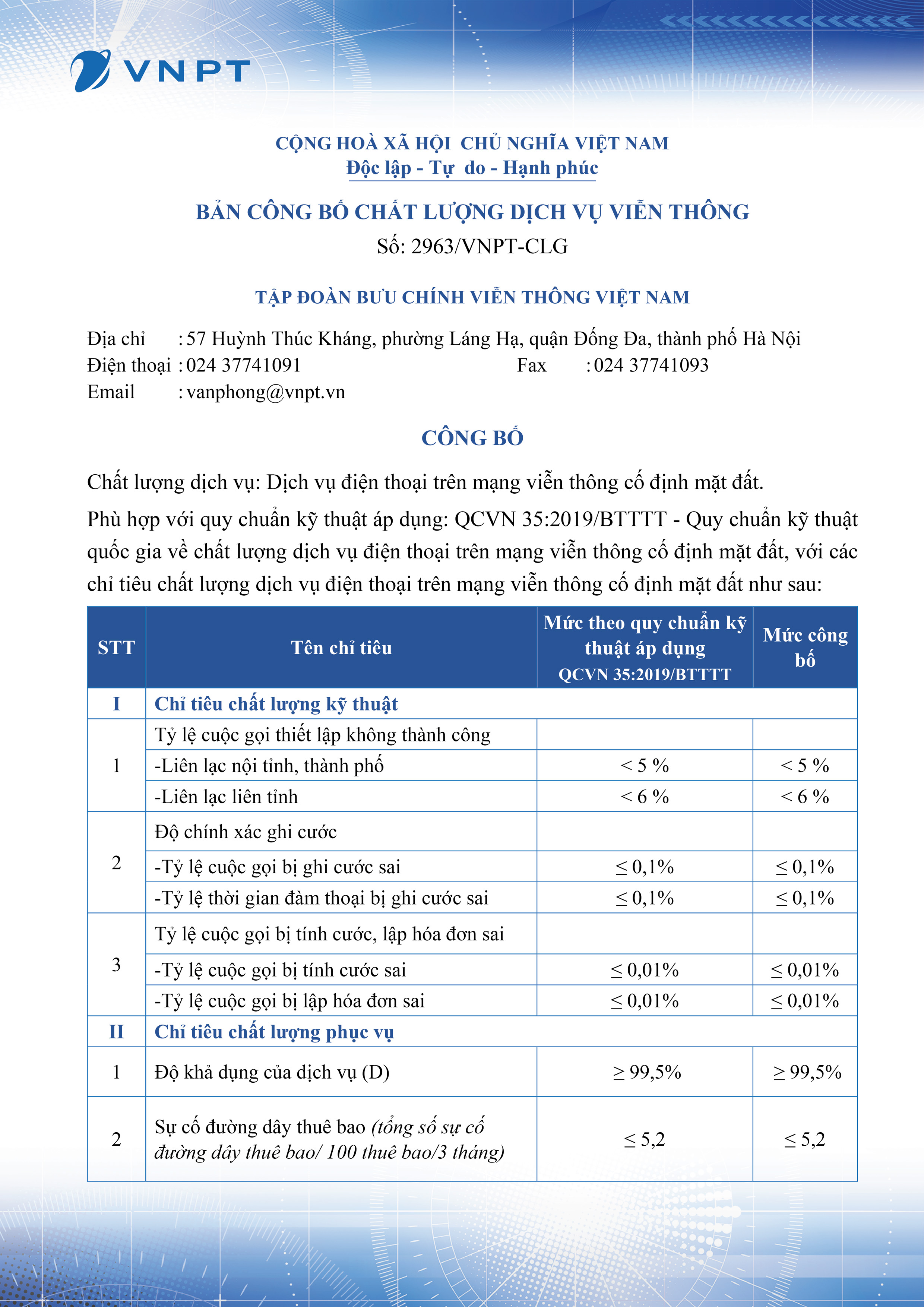 2. Công bố chất lượng Dịch vụ điện thoại trên mạng viễn thông cố định mặt đất