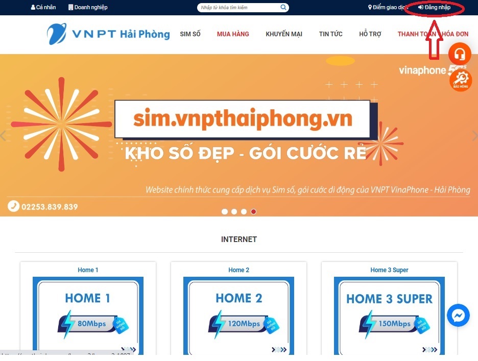 Bước 1: Khách hàng truy cập website https://vnpthaiphong.vn, chọn nút ĐĂNG NHẬP tại góc phải màn hình