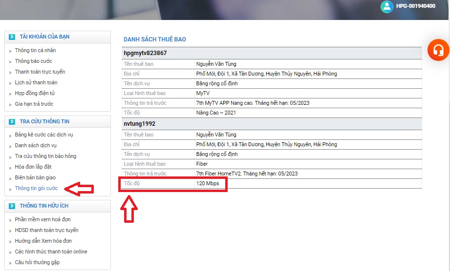Bước 3: Tại giao diện Trang quản trị thông tin, khách hàng chọn Thông tin gói cước để kiểm tra tốc độ và thông tin khác của các dịch vụ mà khách hàng đang đăng ký sử dụng.