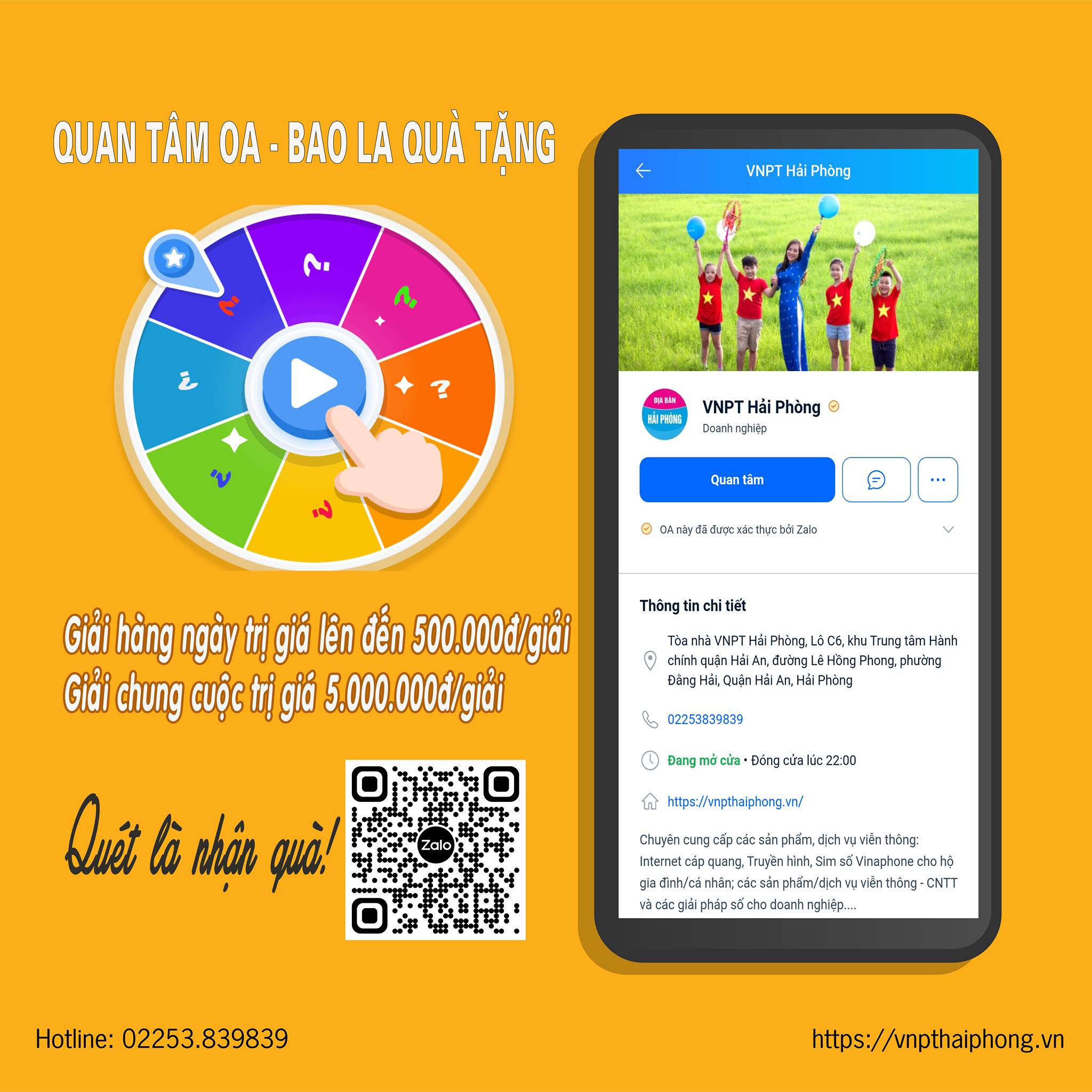 Chương trình “QUAN TÂM OA – BAO LA QUÀ TẶNG” chào đón khách hàng thứ 80.000 quan tâm Zalo OA VNPT Hải Phòng, với chương trình VÒNG QUAY MAY MẮN