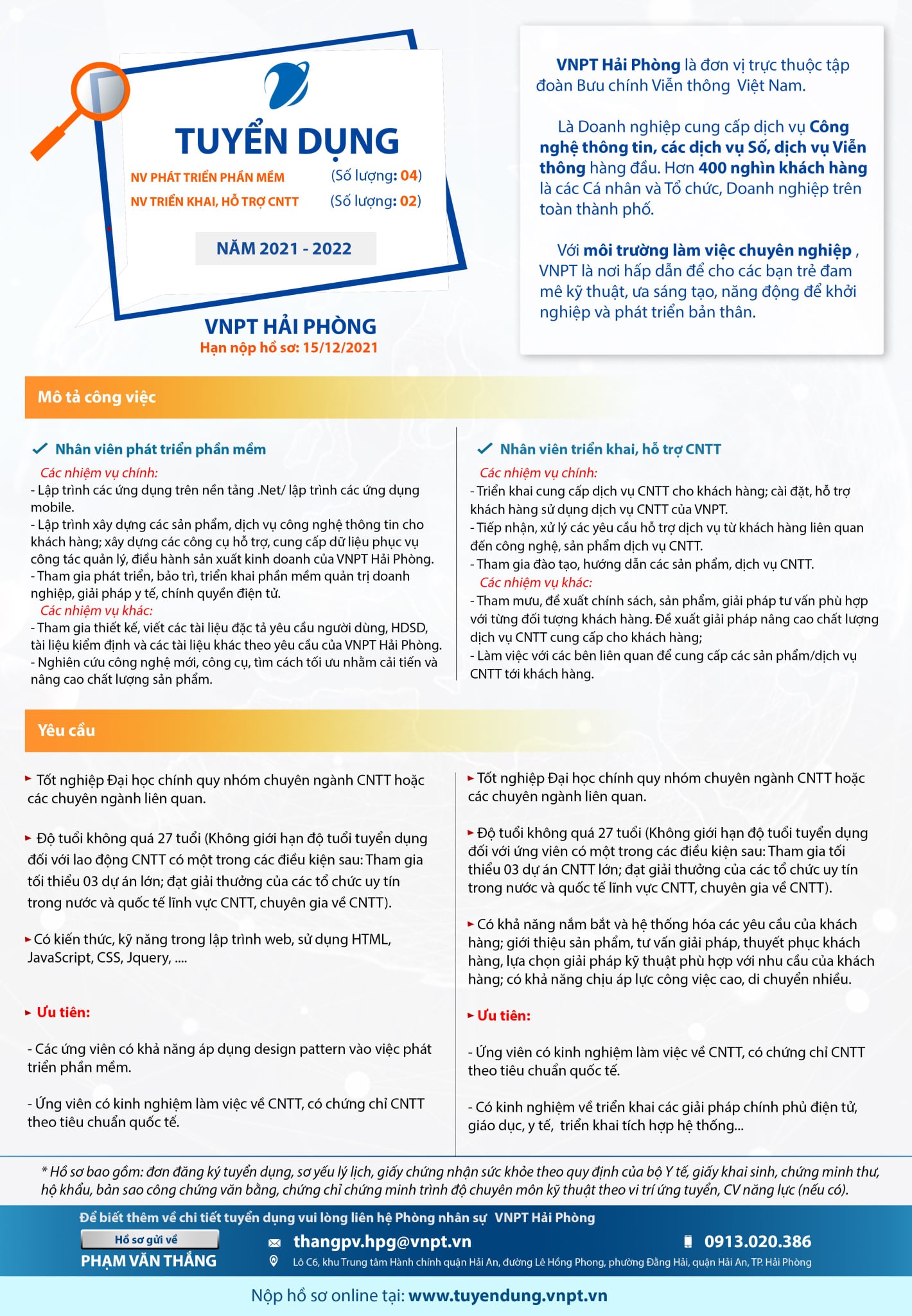 - Liên hệ nộp HS: Mr. Phạm Văn Thắng, Phòng Nhân sự, VNPT Hải Phòng - Địa chỉ: Tòa nhà VNPT, Lô C6, Khu trung tâm hành chính quận Hải An, P. Đằng Hải, Q. Hải An, TP. Hải Phòng - SĐT: 0913.020.386 - Email: thangpv.hpg@vnpt.vn