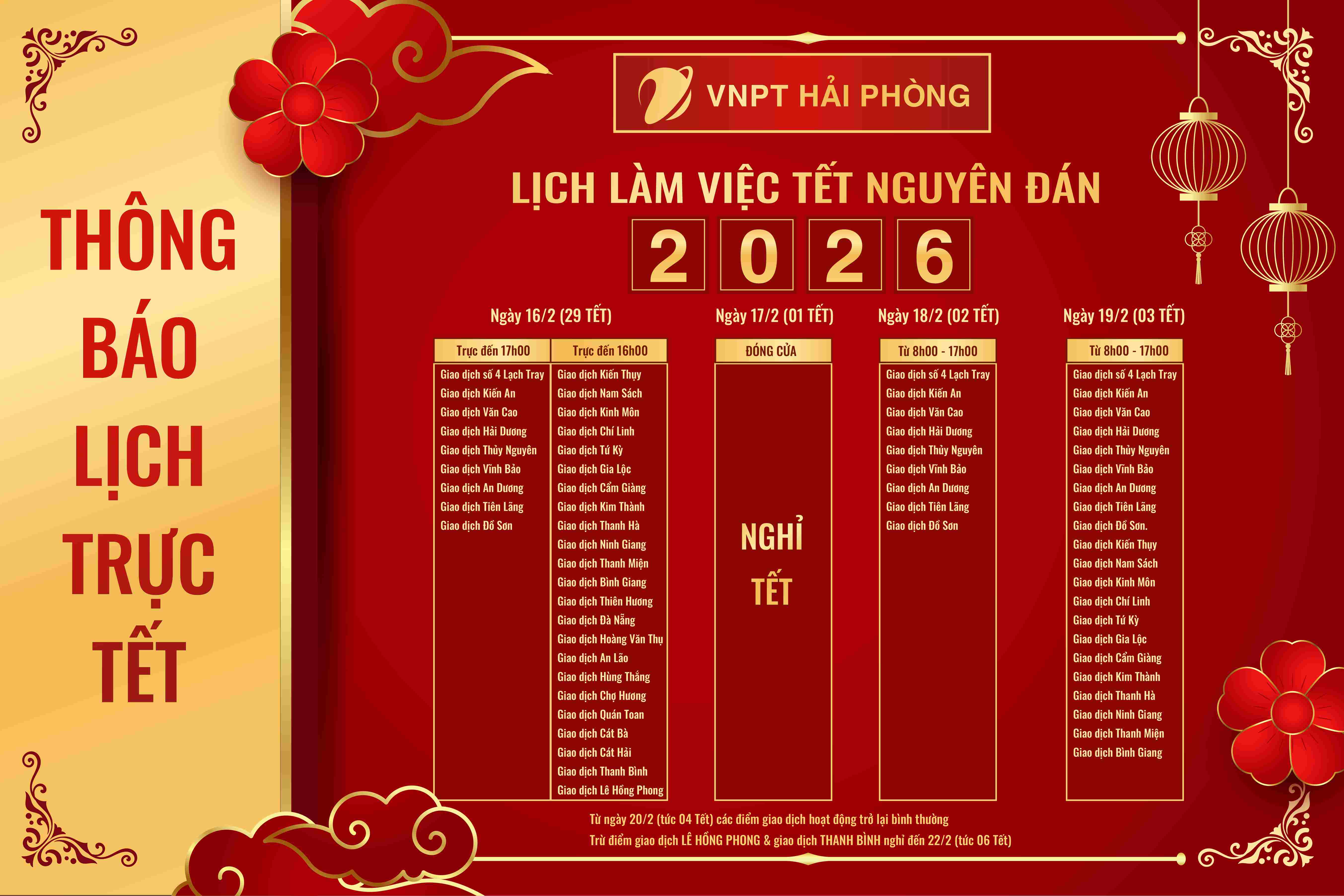 Nhằm đảm bảo duy trì thông tin liên lạc thông suốt và kịp thời hỗ trợ khách hàng trong dịp Tết Nguyên đán, VNPT Hải Phòng trân trọng thông báo lịch trực Tết tại các điểm giao dịch trên địa bàn Thành phố.