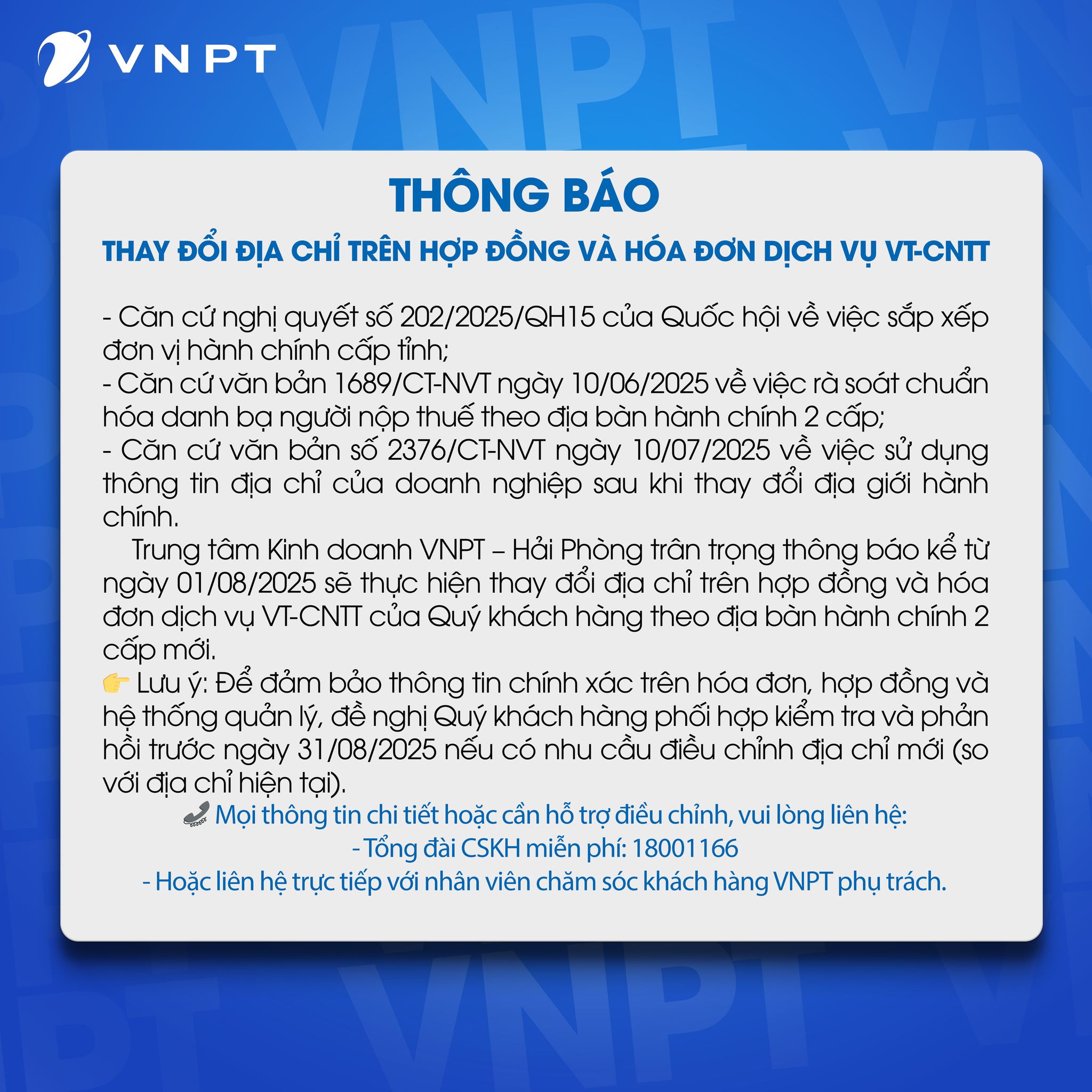 Trung tâm Kinh doanh VNPT – Hải Phòng trân trọng thông báo kể từ ngày 01/09/2025 sẽ thực hiện thay đổi địa chỉ trên hóa đơn dịch vụ VT-CNTT của Quý khách hàng theo địa bàn hành chính 2 cấp mới.